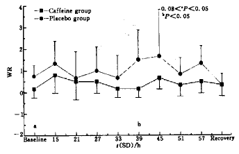从Fig 1可见咖啡因组和安慰剂组仅在基础值之间表现出统计学差异,与SD15 h和recovery综合分析则表明这一差别只能反映出安慰剂组的练习效果较差,到SD15 h时已经没有实际意义.咖啡因组的图形基本呈水平线,正确反应在整个SD期间基本维持在基础水平;而安慰剂组则有一定的波动,并且出现两个低谷.这表明SD可以减少正确反应,而咖啡因可以对抗SD的这一作用,但没有统计学意义.