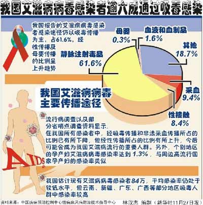 我国艾滋病病毒感染者中有60%通过吸毒感染[图]