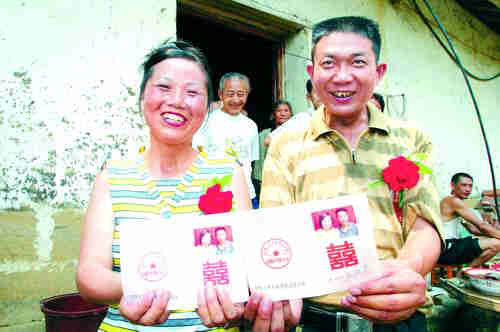 7月30日,曹学良、王代英领取了大红的《结婚证》,新的生活开始了!婚礼在幸福的包围中进行昨日凌晨4时,心情激动的王代英就醒了。她悄悄起身收拾房间打扫院落,在房门上贴上红红的“喜”字。早上6时,前来帮忙的几十位亲戚朋友来到小院,各司其职,张罗着婚礼的各项事宜。