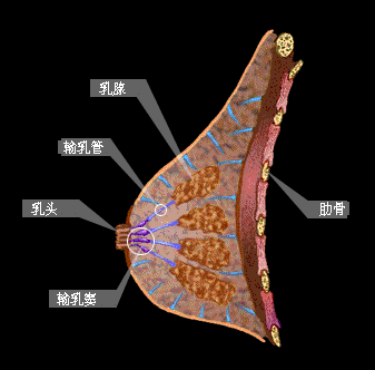 乳房腺体由15~20个腺叶组成,每一腺叶分成若干个腺小叶,每一腺小叶又由10~100 个腺泡组成。这些腺泡紧密地排列在小乳管周围,腺泡的开口与小乳管相连。多个小乳管汇集成小叶间乳管,多个小叶间乳管再进一步汇集成一根整个腺叶的乳腺导管,又名输乳管。输乳管共15~20根,以乳头为中心呈放射状排列,汇集于乳晕,开口于乳头,称为输乳孔。