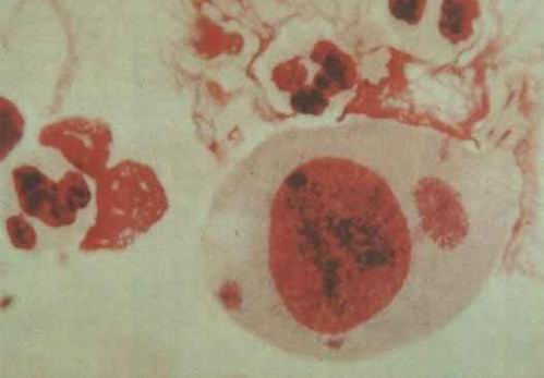 图注:非淋病性尿道炎分泌物涂片 姬姆萨染色 油镜 10×100见到一个大单核细胞,胞浆内有球形和椭圆形的包涵体-衣原体。 衣原体(Chalmydiae)是一类在真核细胞内专营寄生生活的微生物。研究发现这类微生物具有和革兰氏阴性细菌很多相似。这些特性是:(1)有DNA和RNA两种类型的核酸;(2)具有独特的发育周期,类似细菌的二分裂方式繁殖;(3)具有粘肽组成的细胞壁;(4)含有核糖体;(5)具有独立的酶系统,能分解葡萄糖释放CO2,有些还能合成叶酸盐,但缺乏产生代谢能量的作用,必须依靠宿主细胞的代谢中间产物,因而表现严格的细胞内寄生;(6)对许多抗生素、磺胺敏感,能抑制生长。1957年开始将衣原体分类于细菌类。