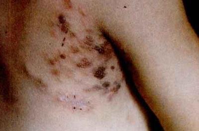图注:aposis肉瘤 皮肤活组织检查 石蜡切片H-E染色 光镜(4×10)(10×10)(10×40)可见肿瘤组织中有许多新形成的血管,血管扩张,内皮细胞肿大突出于管腔内,红细胞外溢,含铁血黄素沉积。肿瘤由成纤维细胞、上皮样细胞淋巴细胞组成,并有大小不等、染色较深的圆形、椭圆形细胞。