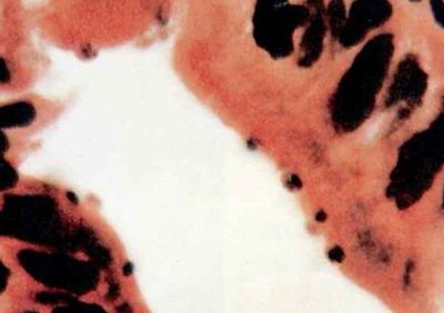 图注:艾滋病合并隐球孢子虫病,在小肠壁绒毛表面呈现黑点。
