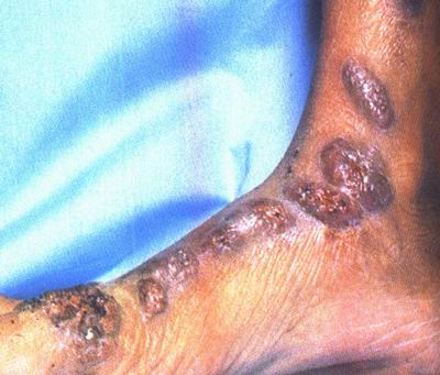 相关图片: 孢子丝菌病(固定型) 孢子丝菌病(淋巴管型) 孢子丝菌病是由申克氏孢子丝菌所引起。本病损害多见于皮肤,极少数见于粘膜、骨骼、肌 肉、中枢神经系统、肺、肝、脾、眼等脏器。发生在皮肤的病主类型可分为固定型、淋巴管型及播散型。淋巴管型损害大部分发生于暴露部位,单侧上肢或下肢,尤以右手多见。大多先有外伤史。潜伏期为5天到6个月,平均为3周,初发为圆形、质硬无痛的皮下结节,以后结节隆起,粘着皮肤,表面淡红到紫红,逐渐软化、溃破,形成溃疡,表面有稀薄分泌物,溃疡边缘常呈紫黑色,谓之孢子丝病下疳,亦称初疮。1-3周后,继发必损害从初疮部位沿淋巴管向心性出现,数目数个到数10个,排列成串,但损害很少超过腋窝或腹股沟淋巴管。 |