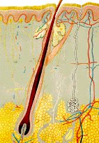表皮是皮肤的浅层结构,由复层扁平上皮构成。从基底层到表面可分为五层,即基底层、棘层、颗粒层、透明层和角质层。 1、基底层:位于表皮的最深层,借基膜与深层的真皮相连。基底层是一层矮柱状上皮细胞。细胞较小、排列整齐,核呈卵圆形胞质中常含有黑色素颗粒。矮柱状上皮细胞之间有黑色素细胞。黑色素细胞略呈圆形,有树枝状突起,胞核较小,能产生黑色素颗粒。黑色素颗粒的多少与皮肤颜色的深浅有关。黑色素颗粒能够吸收紫外线,使深层组织免受紫外线辐射 的损害。基底层的细胞分裂比较活跃,不断产生新细胞并向浅层推移,以补充衰老、脱落的角质细胞。因此,也称生发层。 2、棘层:位于基底层的浅面,由4-10层多边形细胞组成,细胞较大,由许多棘状突起,胞核呈圆形。 3、颗粒层:位于棘层的浅面,由2-3层梭形细胞组成。胞质中有大小不等的透明角质颗粒。普通染色呈强嗜碱性,胞核较小,染色较淡。 4、透明层:位于颗粒层的浅面,由2-3层无核的扁平细胞组成。胞质中含有嗜酸性透明角质,它由颗粒层细胞的透明角质颗粒变性而成。 5、角质层:位于表皮的最浅层,由几层到几十层扁平无核角质细胞组成,细胞质内充满嗜酸性的角蛋白,对酸、碱,摩擦等因素有较强的抵抗力。角质层的表面细胞常呈小片脱落,形成皮屑。 |