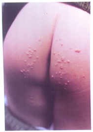 5.疹状黄色瘤:针头或火柴头大小丘疹,棕黄色、橘黄色伴有炎症。有时口腔粘膜上也有。