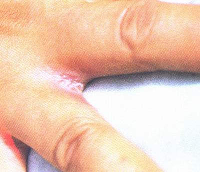 念珠菌病是由念珠菌中的白色念珠菌引起的原发或继发性,急性或慢性,限局性或全身性的炎症性损害,可侵犯皮肤、粘膜、指(趾)甲、内脏器官或血行播散。指间糜烂多见于长期浸泡于水中的作业人员,以3-4指间最为常见,指间皮肤浸渍发白,去除浸渍的皮肤,呈界限清楚的湿润面,基底潮红,可有少量渗液。