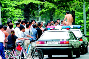裸男坐在警车顶上不下来 记者 王井 摄“快看,那家伙把衣服脱光了!” 昨日下午3时许,西安市含光路大学南路路口围了很多群众。脱光衣服的是个青年男子,中等身材、眉目清秀、头发整齐,穿着也算干净。他一丝不挂地躺在路中间,过往车辆行至此处均减速绕行。不久,他站起来拦汽车,一辆出租车被他逼得节节后退。