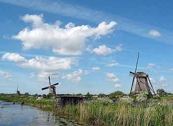 风车是组成荷兰印象当中一个重要的因素。荷兰风车700多年的历史,目前保存完好的已经不多了,其中相当一部分集中在肯德代克一带。在那里,牛群在草地上散步,屋顶的烟囱上冒出袅袅饮烟,远处的蓝天下飘过朵朵白云,不知名的野花儿在河边兀自开着,而古老的风车便矗立在寂静的小河边……塔式风车房与芦苇盖顶的小屋是荷兰极具特色的民居,随着时光的流逝,有的装修成了屋宅,有的改建成了博物馆,如今它们已经变成荷兰的一种标志,也成为了游客眼中极其珍贵的景观。