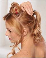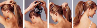 第三步:将刚才在头顶分出的头发梳理通顺,松松地拧在一起,然后把拧好的这绺头发绕在扎起的马尾辫根部周围,绕一到两圈即可。用金属发卡把头发末梢别在马尾辫下面。