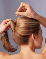 第三步:在后脑中央部梳一个马尾辫。一只手握住辫子,另一只手将辫子拧成一股绳,发稍松开紧贴在头顶上。