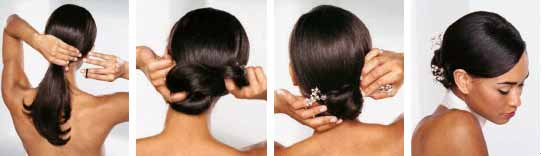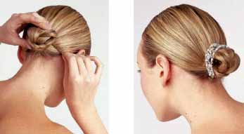 第四步:将马尾辫松松地盘在刚才缠过的辫子根周围。用卡子把辫梢固定别好。注意,马尾辫不要绕得太紧,因为这个头型的整体感觉应该是有一点松弛的。