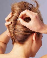 第四步:用大量的卡子把所有松弛的头发塞在发辫下面卡好,直到从后面看上去完全平整。给头发上喷一些定型液。把发梢环状别在头顶。留出几绺发丝勾勒出脸部轮廓。最后使用大量定型液来固定发型。