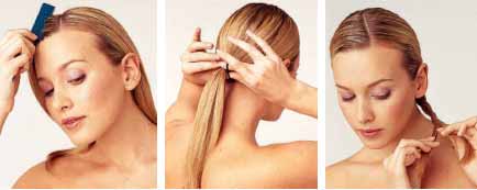 第三步:把扎好的马尾辫均匀分成三股,并把每一股编成小辫,用橡皮筋在尾端扎好。头发较细少的人可以用整发剂使头发看上去多一些。