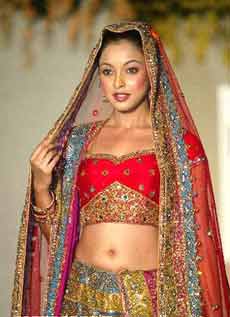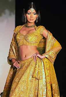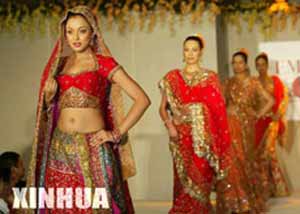 由于印度人对传统新娘服装的需求量很大,这些服装的设计也就成为印度服装设计师经久不衰的设计主题。 10月24日,2004年新娘礼服时装展在新德里举行。(摄影/新华社记者 安治平)