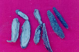 药材 干燥的块根呈长椭圆形或锤形,两头较尖,略弯曲,长3-12厘米,直径1-3厘米,外皮红棕色,有皱纹,易层层脱落,内面淡红褐色。纵切瓣切面周边常向内卷曲,中部有一凸起的棱线。斜片呈卵圆形,厚1.5-3毫米,中央略薄,周边较厚,微翘起或微弯曲。质轻,易折断,折断时有粉尘飞出,断面白色或淡红色。气微,味甘。以肥大、断面粉红色、粉性足者为佳。