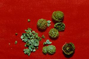 药材 干燥种子团呈圆球形或椭圆形,直径1.5-2.5厘米,表面灰白色或灰棕色。中间有白色隔膜分成3瓣,每瓣有种子多数粘连紧密。种子卵圆状多角形,长3-5毫米,直径约3毫米。表面灰棕色,被一层白色透明的假种皮,背稍隆起,合点约在中央,种脐位于背侧面,种脊为一纵沟,经腹面至合点,破开后里面灰白色。气芳香,味辛辣。以个圆、坚实者为佳。