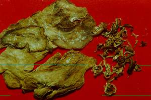 药材 川佛手:片小质厚,不平整,质较紧,易折断,绿边白肉,稍有黄色花纹,气清香,浓郁。