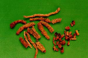 药材 干燥根茎呈圆柱形,平直或弯曲,多不分歧。表面灰黄色至黄棕色,有光泽,粗糙,具纵皱及横环纹。质硬而脆,易折断,折断时有粉尘飞出;断面皮部灰黑色,木部黄白色。气微,味极苦而持久。以条粗、折断时有粉尘、断面灰黑、味苦者为佳。