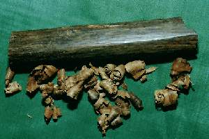 药材 干燥的根部心材,事条块状。表面红褐色至棕紫色,有刨削之刀痕,光滑有光泽,并有纵长线纹。如劈裂之,断面粗糙,强木质纤维性,纹理细而质坚硬。气香味淡稍苦,烧之香气浓郁。以红褐色、结实、烧之有浓郁香气,表面无黄白色外皮者为佳。