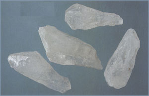 药材 为不规则的结晶体,大小不一。无色,透明或半透明,表面略平滑或凹凸不平,具细密纵棱,有下班样光泽。质硬而脆,易砸碎。气微,味微甜而涩。以色白、透明、质硬而脆、无杂质者为佳。