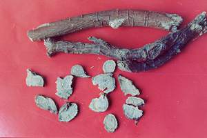 药材 干燥根呈圆柱形。表面有明显纵皱,栓皮很薄,棕黄色或灰棕色。质坚硬,不易折断,折断面粗纤维状。横断面黄白色,形成层明显。切面淡黄白色,有环状车轮,木质部作放射纹。以整齐、色黄白、味苦者为佳。