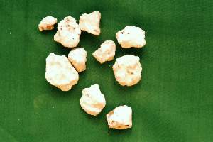 药材 为不规则的块状,扁平形或圆形,大小不一,表面白色或淡红色,有凹陷或小孔洞,显粉性。体轻而质松,易碎,断面白色或淡红色,呈颗粒状,并有细小孔隙,有吸湿性。气无,味微涩。以块大、白色或显淡红色、质轻者为佳。不熔融。