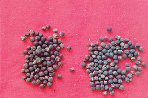 药材 干燥果实圆球形,表面灰黑色或黑褐色,被灰白色粉霜,有4条纵沟;用放大镜观察,密布淡黄色小点。底部有薄膜状宿萼及小果柄,宿萼包被果实的1/3-2/3,边缘5齿裂,常深裂成两瓣,灰白色,密生细柔毛。体轻,质坚韧,不易破碎,横断面果皮灰黄色,有棕褐色油点,内分四室,每室有种子1枚,种仁白色,有油性。气特异而芳香,味淡微辛。以粒大、饱满、气芳香、无杂质者为佳。