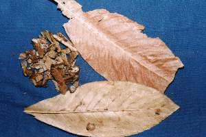 药材 干燥叶片长椭圆形。叶端渐尖,基部楔形,上部锯齿缘,基部全缘,羽状网脉,中脉下面隆起。叶面灰绿色、黄棕色或红棕色,上面有光泽;下面茸毛棕色。叶柄短,叶革质而脆,气无,味微苦,以叶大、色灰绿、不破碎者为佳。