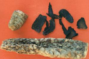 药材 甜苁蓉呈圆柱状而稍扁,一端略细,稍弯曲。表面灰棕色或褐色,密被肥厚的肉质鳞片,呈覆瓦状排列。质坚实,微有韧性,肉质而带油性,不易折断,断面棕色,有花白点或裂隙。气微弱,味微甜。