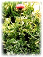 植物形态 一二年生草本。茎直立,高30~200cm,多分枝,光滑后被蛛丝状毛,有纵棱槽。叶互生,基部叶常平铺地面,成莲座状,长椭圆状披针形,深或浅羽状分裂,缘齿有尖刺,长40~80cm,宽10~30cm,表明亮绿色,有乳白色斑纹,基部抱茎;中部、上部叶片渐小,上部叶披针形。头状花序直径3~6cm,单生枝顶,总苞宽球形,总苞片革质,顶端有长刺;管状花紫红色、淡红色或少有白色。瘦果长椭圆形,暗褐色或黑色,有纵条纹及白色斑纹;冠毛多数,白色,不等长,基部合生成环。花期5~6月、果期6~7月。