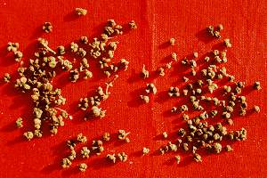 药材 干燥果实呈五棱状扁球形。表面绿色或绿褐色,粗糙,有细皱纹及鬃眼(油室)。以色绿、饱满者为佳。