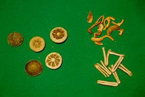 酸橙枳壳:为植物酸橙的近成熟果实,多横切成半圆球形。表面绿褐色或绿棕色,略粗糙,散生多数油点,顶端一面有花柱残基,基部一面有果柄痕。