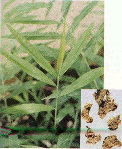 性状 根茎扁平块状,指状分枝,长3~7cm,厚1~2cm。表面灰黄色或淡灰棕色,粗糙,具纵皱纹及环节。分枝处常有鳞叶残存,分枝顶端 有茎痕或芽。质坚实,断面黄白色或灰白色,粉性和颗粒性,内皮层环纹明显,维管束及黄色油室散在。气香特异,味辛辣。