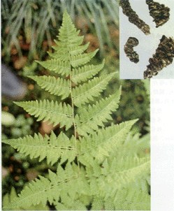 植物形态 多年生草本,高65~90cm。根茎粗短,倾斜,密生棕色披针形鳞片。叶簇生,叶柄褐色,长30~50cm,被多数鳞片;叶片厚纸质,矩圆形,长25~80cm,宽20~40cm,二回羽裂,仅羽轴下部有小鳞片,下部羽片长约 15cm,宽2~3cm,羽裂至 1/2或略深;裂片三角形或三角状矩圆形,先端尖,具微锯齿,叶脉网状,有网眼1~2行,网眼外小脉分离,无内藏小脉。孢子囊群长形,生于主脉两侧对称的网脉上;囊群盖长肾形,以外侧边着生网脉,开向主脉。
