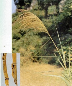 植物形态 多年生草本。秆可达4m,直径0.2~1cm。叶广披针形,长30~60cm,宽1~3.5cm,先端渐尖,基部钝圆。边缘粗糙;叶鞘圆筒状;叶舌极短,截平或为一圈纤毛。圆锥花序长10~40cm,分枝纤细,呈毛帚状,下部枝腋间有白色柔毛;小穗紫褐色,长1.2~1.6cm,有 4~7 小花,第 1 小花常为雄性,其它为两性;外稃无毛,第2 外稃基盘棒状,具长0.6~1.2 cm的柔毛。颖果长圆形。花果期夏、秋季。