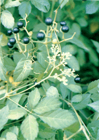 | 植物形态: | 多年生蔓生草本。根茎横走。茎紫绿色,有纵棱,卷须二歧,幼枝有柔毛,后变光滑。叶为掌状复叶,小叶5,排列成鸟爪状,中间的呈椭圆状卵形,小叶柄长2~3cm,先端短尖,基部楔形或圆形,两侧的4枚小叶较小,成对着生在同一小叶柄上,小叶的边缘具较均匀的圆钝锯齿。聚伞花序腋生或假腋生,序梗长3~12cm; 花小,黄绿色,具短梗;萼怀状;花瓣4,卵状三角形;雄蕊4,与花瓣对生,花药长椭圆形;雌蕊1,子房上位,2室。浆果倒圆卵形,直径约7mm,成熟时黑色。种子2~4粒;花期6月,果期8~9月。 |
