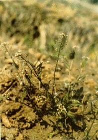 植物形态 一年生或二年生草本,高15~40cm,稍有分枝毛或单毛。基生叶丛生,有柄,大头羽状分裂,裂片常有缺刻;茎生叶狭披针形,长1~2cm,宽约2mm,基部耳状抱茎,边缘有缺刻或锯齿。总状花序顶生及腋生,花小,萼片4;花瓣44,白色,呈十字展开;雄蕊6,四强;子房上位。短角果倒三角形或倒心形,扁平,先端微凹,有极短的宿存花柱。种子2列,长椭圆形,淡褐色。花期3~4月,果期5~6月。
