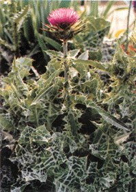 植物形态 一二年生草本。茎直立,高30~200cm,多分枝,光滑或被蛛丝状毛,有纵棱槽。叶互生,基部叶常平铺地面,成莲座状,长椭圆状披针形,深或浅羽状分裂,缘齿有尖刺, 长40~80cm,宽10~30cm,表面亮绿色,有乳白色斑纹,基部抱茎;中部、上部叶片渐小,上部叶披针形。头状花序直径3~6 cm,单生枝顶,总苞宽球形,总苞片革质,顶端有长刺;管状花紫红色、淡红色或少有白色。瘦果长椭圆形,暗褐色或黑色。有纵条纹及白色斑纹;冠毛多数,白色,不等长,基部合生成环。花期5~6月,果期6~7月。