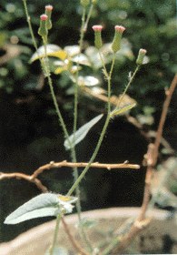 植物形态 一年生草本,高10~50cm。茎分枝,枝柔弱,粉绿色。叶互生,稍带肉质,茎下部叶卵形,攀状分裂,长4~9cm,上部叶较小,抱茎,上面绿色,下面多紫红色。头状花序直径1~1.3cm,有长梗,花枝常2歧分枝; 总苞圆柱形,苞片1层,约与花冠等长;花管状,红色,两性。瘦果圆柱形,长5~6mm,有棱,冠毛白色,柔软。花期春至秋季。