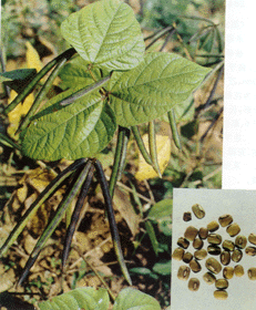 | | 中文名: | 绿豆 | | 类 别: | 种子类 | | 英文名: | Mung Bean | | 别 名: | | | 来 源: | 为豆科植物绿豆Phaseolus radiatus L.的种子。 | | 采 制: | 秋季种子成熟时采收,拔取全株,晒干,将种子打落 ,簸净杂质。 | | 性 味: | 种子短矩圆形,长4~6mm。表面绿黄色或暗绿色,光泽。种脐位于一侧上端,长约为种子1/3,呈白色纵向线形;种皮薄而韧,剥离后露出淡黄绿色或黄白色的种仁,子叶2枚,肥厚。质坚硬。性凉,味甘。 | | | 植物形态: | 一年或多年生草本,大部缠绕状,有淡褐色长硬毛。叶羽状,小叶3,顶生小叶卵形,长6~10cm,先端渐尖,侧生小叶偏斜;托叶大,阔卵形,盾状着生。总状花序腋生;花冠黄色,旗瓣近方形,顶端微缺,翼瓣卵形,龙骨瓣镰刀状;花萼斜钟状,萼齿4,近无毛。荚果圆柱形,长6~8cm,宽约6mm,有散生淡褐色的长硬毛。花期8~10月,果期9~11月。 | | 生长地: | 我国各地均有栽培。 | | 化学成份: | 含蛋白质、脂肪、维生素B1、及B2、磷脂酰胆碱(phosphatidyl choline)、磷酯酰乙醇胺(phosphatidylethanolamine)、磷酯酰肌醇(phosphatidylinositol)、磷脂酰丝氨酸(phosphatidylserine)、磷脂酸(phosphatidic acid)等。 | | 功能主治: | 清热解毒,清暑,利水。用于暑热烦渴、水肿、泻痢、丹毒、痈肿、解热药毒。 | | 附注: | | | |