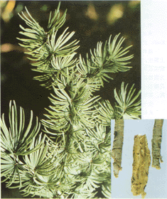 | 植物形态: | 落叶乔木。叶在长枝上螺旋状散生,在短枝上15~30簇生,辐射平展,秋后呈金黄色,条形或倒披针状条形,扁平,下面沿隆起的中脉有两条气孔带。雌雄同株;雄球花数个簇生于短枝顶端;雌球花单生于短枝顶端。苞鳞大于珠鳞,珠鳞腹面基部有2胚珠。球果直立,卵圆形;种鳞木质,熟后脱落;苞鳞短小;种翅与种鳞几等长。花期4~5月,球果11月成熟。 | | 生长地: | 生于山林林缘及杂木林中;多栽培。产于江苏、安徽、浙江、江西、福建、湖北、湖南。 | | 化学成份: | 含土槿皮酸、酚性成分、鞣质及色素。 | | 功能主治: | 杀虫,止痒。用于疥癣瘙痒。 | | 附注: | 根皮不规则长条状,扭曲而稍卷,厚1~5mm。外表面灰黄色,粗糙,有灰白色横向皮孔,粗皮常呈鳞片状剥落而现红棕色;内表面黄棕色至红棕色,较平坦。质韧,折断面呈裂片状,可层层剥离。气微,味苦、涩。树皮呈板片状,厚约至8mm,粗皮较厚,外表面呈龟裂状,内表面较粗糙。 | |