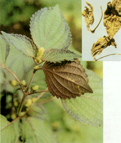 | | 中文名: | 紫苏叶 | | 类 别: | 叶类 | | 英文名: | Perilla Leaf | | 别 名: | | | 来 源: | 为唇形科植物紫苏Perilla frutescens(L.) Britt.的叶或带嫩枝。 | | 采 制: | 夏季枝叶茂盛时采收,除去杂质,晒干。 | | 性 味: | 叶片多皱缩卷曲、破碎,边缘具圆锯齿。两面紫色或上表面绿色,下表面紫色,疏生灰白色毛,下表面有多数凹点状的腺鳞。叶柄长2~7cm,紫色或紫绿色。嫩枝直径2~5mm,紫绿色,断面中部有髓。气清香,味微辛。性温,味辛。 | | | 植物形态: | 一年生草本,高60~90cm,上部有白色柔毛。叶对生,叶片卵圆形或圆形,长3~9.5cm,宽2~8cm,先端渐尖或尾尖,基部近圆形,边缘有粗锯齿,两面呈紫红色,淡红色,有腺点。轮伞花序2花,组成偏向一侧的假总状花序;苞片卵形,顶端急尖或呈尾状;花萼钟状,外有柔毛及腺点;花冠紫红色或淡红色,花冠筒内有环毛,2唇形,上唇微凹,下唇3裂; 雄蕊4。小坚果近球形,黄褐色,有网纹。花期7~8月,果期9~10月。 | | 生长地: | 全国有栽培。 | | 化学成份: | 含挥发油,油中主要为紫苏醛(l-perillaldehyde)、紫苏醇(I-perilla-alcohol)、柠檬烯、芳樟醇、薄荷脑、丁香烯,并含香薷酮(elshottziaketone)、紫苏酮、丁香酚等。 | | 功能主治: | 解表散寒,行气和胃。用于风寒感冒、咳嗽呕恶、妊娠呕吐、鱼蟹中毒。 | | 附注: | 紫苏梗理气宽中,紫苏子降气消痰。 | | |