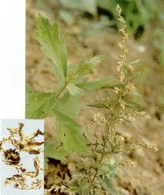 植物形态 多年生草本,高0.5~1.2m。茎直立,被白色细软毛,上部分枝。叶互生,中下部叶片广阔,3~5深裂或羽状深裂,裂片椭圆形或椭圆状披针形,边缘有不规则的锯齿,上面散生白色腺点,疏生毡毛,下面密生白色毡毛。头状花序钟形,长3~4mm,直径2~2.5mm,几无柄;总苞片4~5层,密被白色绵毛,边缘膜质,外层披针形;雌花长约1mm;两性花结实,长约2mm,紫褐色。瘦果椭圆形,无毛。花期7~10月。