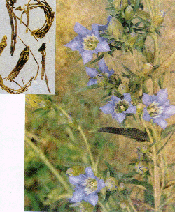 | 植物形态: | 多年生草本。茎略具四棱,粗糙,绿色或稍带紫色。叶对生,下部叶鳞片状;中、上部叶卵状披针形或狭披钉形,边缘及下面主脉粗糙,基部抱茎。花簇生于茎顶和上部叶腋;花萼钟形,膜质;花冠蓝紫色,钟形,5裂。蒴果卵圆形,有柄。花期9~10月,果期10月。 |