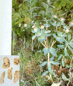 | 植物形态: | 多年生草本,高达40cm,有白色乳汁。叶互生,叶片矩圆形至矩圆状披针形,长3~8cm,宽1~3cm,全缘,叶状苞片5,轮生。总状花序多歧聚伞状,通常5伞梗,每伞梗又生出3小伞梗或再抽第3回小伞梗;杯状总苞裂片内面近无毛,外面有柔毛,边缘有睫毛,腺体肾形。蒴果密生短柔毛或无毛。花期5~6月,果期6~7月。 | | 生长地: | 生于干草原、向阳山坡。主产东北、华北。 | | 化学成份: | 含二萜醇类化合物,包括岩大戟内酯(jolkinolide)A、B,狼毒大戟甲、乙素(fischeriana A,B)等,并含大戟醇(euphol)、皂甙、强心甙、甾醇、酚类及鞣质。 | | 功能主治: | 性平,味辛;有毒。 | | 附注: | 散播结,杀虫。外用于淋巴结结核,皮癣;灭蛆。 | |