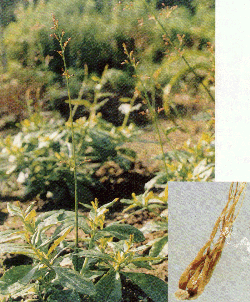 | | 中文名: | 土人参 | | 类 别: | 根类 | | 英文名: | Panicled Fameflower Root | | 别 名: | 水人参、参草、紫人参、福参。 | | 来 源: | 为马齿觅科植物栌兰Talinum paniculatum (Jacq.)Gaertn. 的根。 | | 采 制: | 秋、冬季挖根,洗净,晒干或蒸后晒干。 | | 性 味: | 性平,味甘。 | | | 植物形态: | 一年生草本,高达60cm,肉质。茎直立,分技,绿色,基部稍带木质。叶互生,倒卵形或倒卵状长椭圆形,长5~7cm,宽2.5~3.5cm,先端略凹陷而有细凸头,基部渐狭成短柄,全缘。圆锥花序顶生或侧生,多呈2歧分枝;花瓣5,淡紫红色;雄蕊10余枚;子房上位,1室,胚珠多数。蒴果近球形,熟时3瓣裂。种子多数,黑色,有光泽,具微细腺点。花期6~7月,果期9~10月。 | | 生长地: | 多为栽培。分布于长江以南各地。 | | 化学成份: | 含芸苔甾醇、β-谷甾醇、豆甾醇。 | | 功能主治: | 健脾润肺,止咳,调经。用于脾虚劳倦、泄泻,肺劳咳痰带血、眩晕潮热、盗汗自汗、月经不调、带下。 | | 附注: | 主根圆柱形,直径1~3cm,长短不等,有的微弯曲,分枝如人参状,并有少数须根残留。肉质坚实。表面棕褐色,去皮者莫棕色,断面乳白色。 | | |