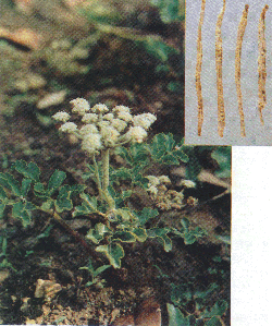 | | 中文名: | 北沙参 | | 类 别: | 根类 | | 英文名: | CoasiaI GIehnia Root | | 别 名: | 莱阳参、海沙参、银沙参、辽沙参。 | | 来 源: | 为伞形科植物珊瑚菜 Glehnia littoralis Fr. schmidt ex Miq.的根。 | | 采 制: | 夏、秋季采挖,除去须根、外皮,干燥。 | | 性 味: | 根长圆柱形,偶有分枝。表面淡黄白色,偶有外皮残存,全体有细纵皱纹及纵沟,并有棕黄色点状细根痕。顶端常留有黄棕色根茎残基,上端稍细,中部略粗,下部渐细。质脆,易折断,断面皮部浅黄白色,木部黄色。气特异,味微甘。 性微寒,味甘、微苦。 | | | 植物形态: | 多年生草本。茎大部埋在沙中,部分露于地面,密被灰褐色绒毛。基生叶卵形或宽三角状卵形,三出式羽状分裂或2~3回羽状深裂,具长柄;茎上部叶卵形,边缘具有三角形圆锯齿。复伞形花序顶生,密被灰褐色绒毛;伞幅10~14,不等长;小总苞片8~12,线状披针形;花梗约30;花小,白色。双悬果近球形,密被软毛,棱翅状。花期5~7月,果期6~8月。 | | 生长地: | 生于海边沙滩。主产山东、河北、辽宁;有栽培。 | | 化学成份: | 含欧前胡素(imperatorin)、补骨脂内酯(psoralen)。佛手内酯、圆当归内酯-7-0-β-龙胆二糖甙(oosthenol-7-0-β-gentio-bioside)等多种香豆素,并含生物碱、淀粉、微量挥发油等。 | | 功能主治: | 养阴清肺,益胃生津。用于肺热燥咳、劳嗽痰血、热病津伤口渴。 | | 附注: | | | |