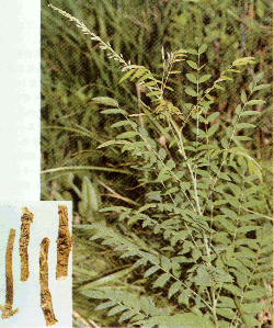 | 化学成份: | 含苦参碱(matrine)、氧化苦参碱(oxymatrine)、羟基苦参碱(sophor-anol)、N-甲基金雀花碱(N-methylcytisine)、安那吉碱(anagyrine)、膺靛叶碱(bap-iifoline)、脱氢苦参碱(sophocarpine)、d-异苦参碱(d-isomatrine)、苦参啶(kurarid-in)。去甲苦参酮(norkurarinone)、苦参啶醇(kuraridinol)、苦参醇(kurarinol)、新苦参醇(neo-kurarinol)、去甲苦参醇(norkurarinol)、异苦参酮,另含芒柄花黄素(f-ormononetin)。 |