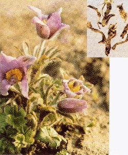 植物形态 多年生草本,高10~30cm,全株密被白色绒毛。基生叶4~5,3全裂,中央裂片通常有柄,3深裂,侧生裂片较小,裂片倒卵形,先端常不规则2~3浅裂;叶柄长5~7cm,基部呈鞘状。花茎1~2,总苞的管长3~10mm,裂片条形;花单生,萼片6,2轮,蓝紫色;雄蕊多数。瘦果多数,聚成头状,宿存花柱羽毛状,长3.5~6.5cm。花期3~4月,果期4~5月。